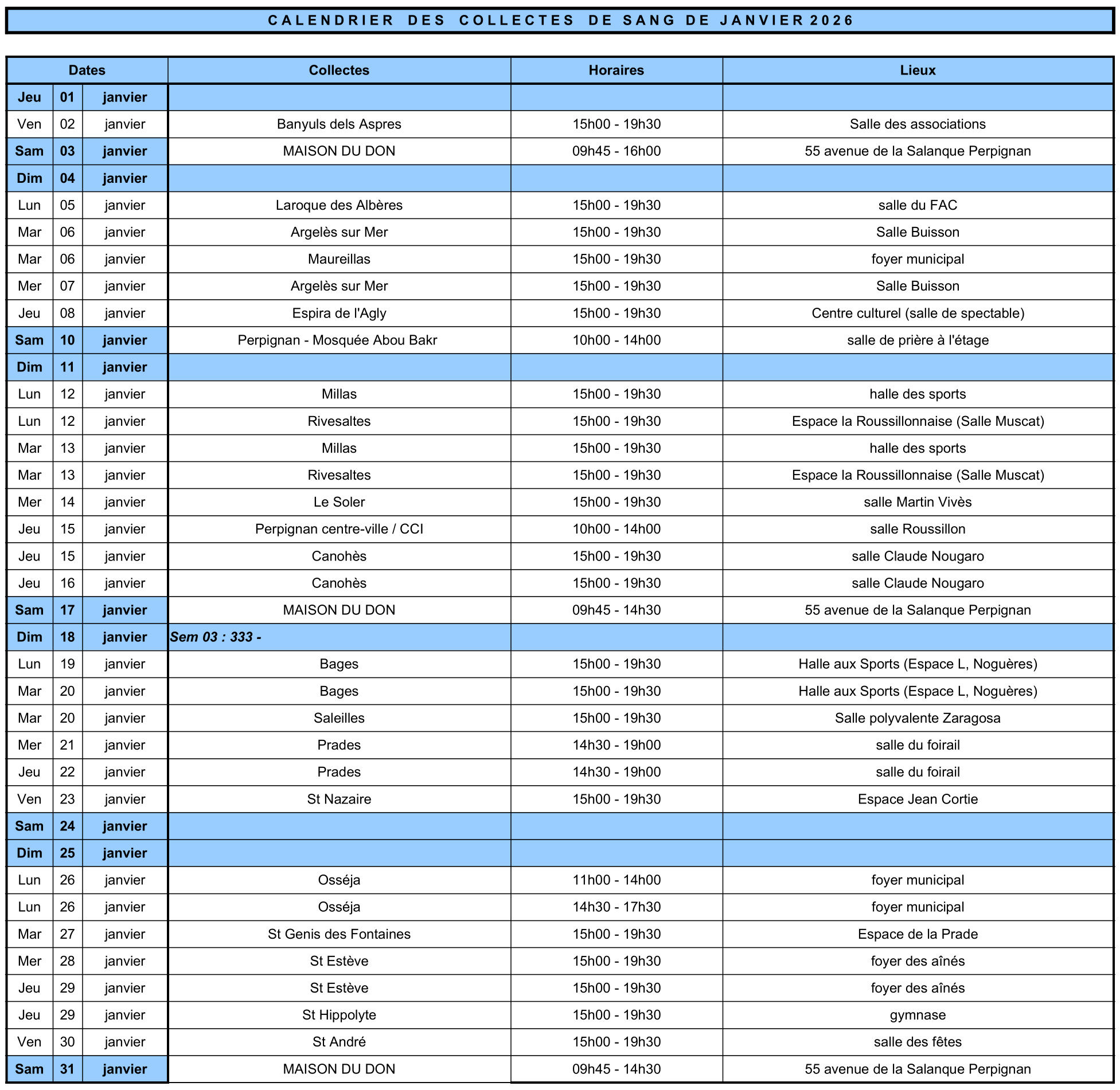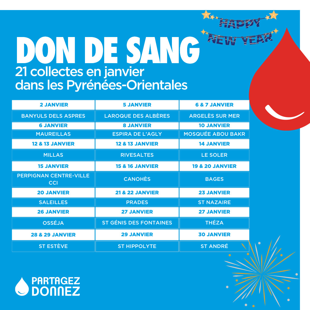 Calendrier collectes de sang – janvier 2026